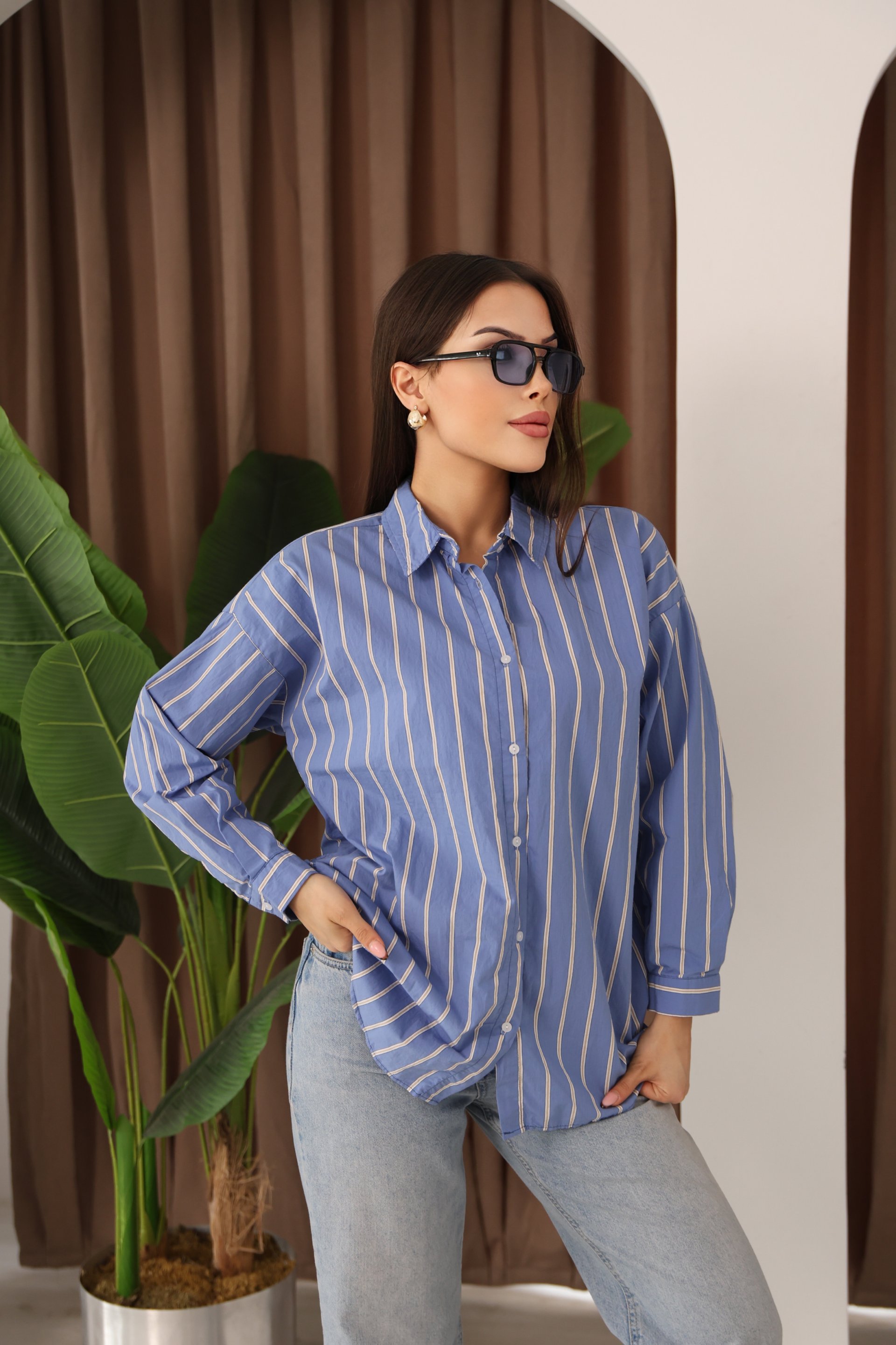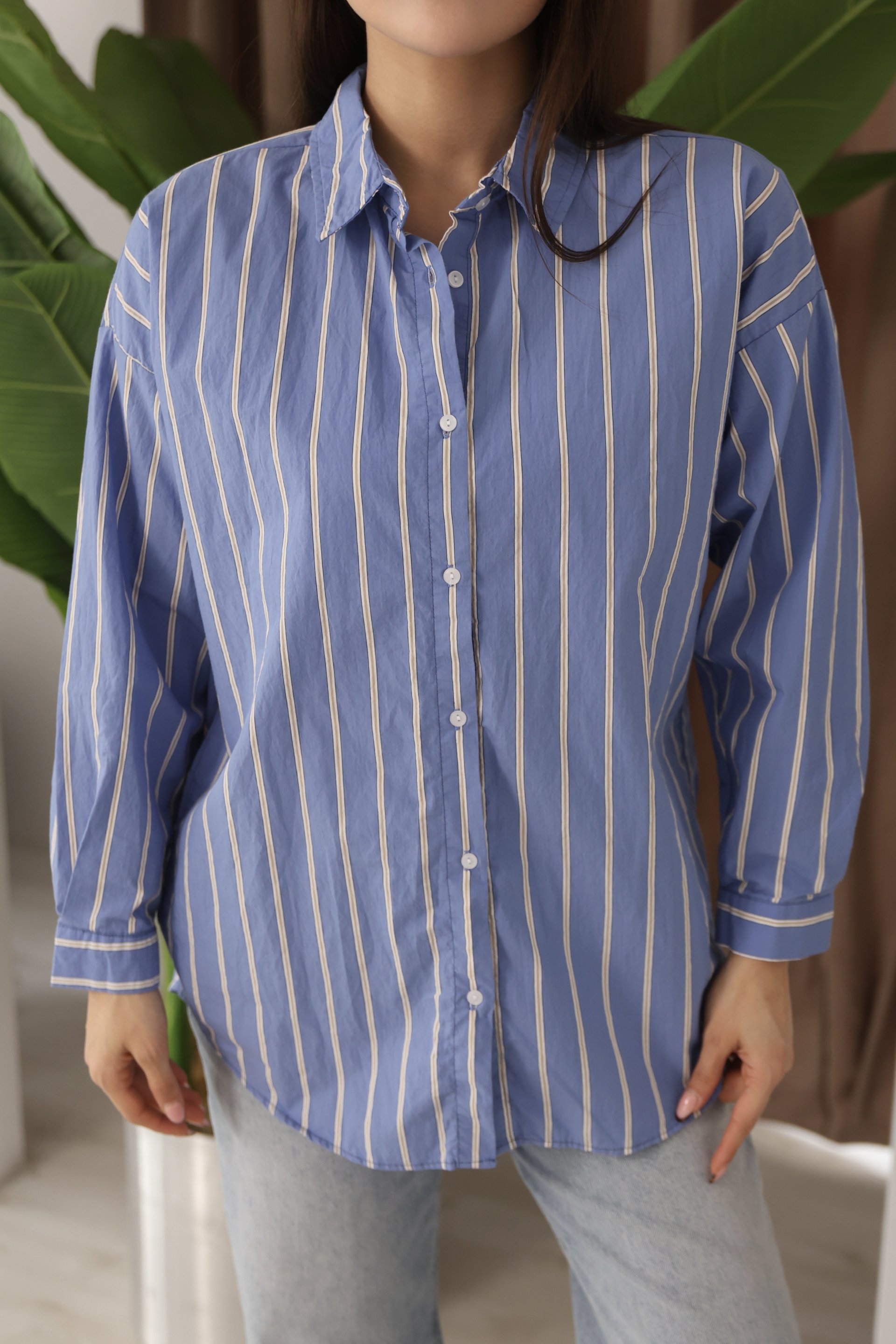 - Rahat ve şık bir görünüm için ideal, tüm mevsimlerde tercih edilebilen beyaz çizgili mavi kadın gömlek. - Uzun kollu tasarımı ile mevsim geçişlerinde ve serin havalarda konforlu bir kullanım sunar. - Cepsiz yapısı sayesinde sade ve şık bir görünüm elde edilirken, günlük kullanım için pratiklik sağlar. - Gömlek yaka detayı ile klasik ve zamansız bir stil oluşturur; her türlü kombinle uyum sağlar. - Full düğme kapama özelliğiyle kolayca giyilip çıkarılabilir ve farklı stiller yaratma imkanı sunar. - Basic koleksiyonun bir parçası olarak, günlük casual ortamlarda rahatlıkla tercih edilebilir. - Poplin dokuma tipi, dayanıklılığı artırarak uzun süreli kullanım vaat eder. - Standart boyu ile vücut hatlarını saran ancak sıkmayan rahat bir kalıba sahiptir. - Pamuk-Viskon-Polyester karışımından üretilmiş materyali sayesinde yumuşak dokusuyla cildinize nazikçe dokunur. - Yetişkin kadınlar için tasarlanmış olup, regular kalıbı sayesinde her vücut tipine uygun konforludur.